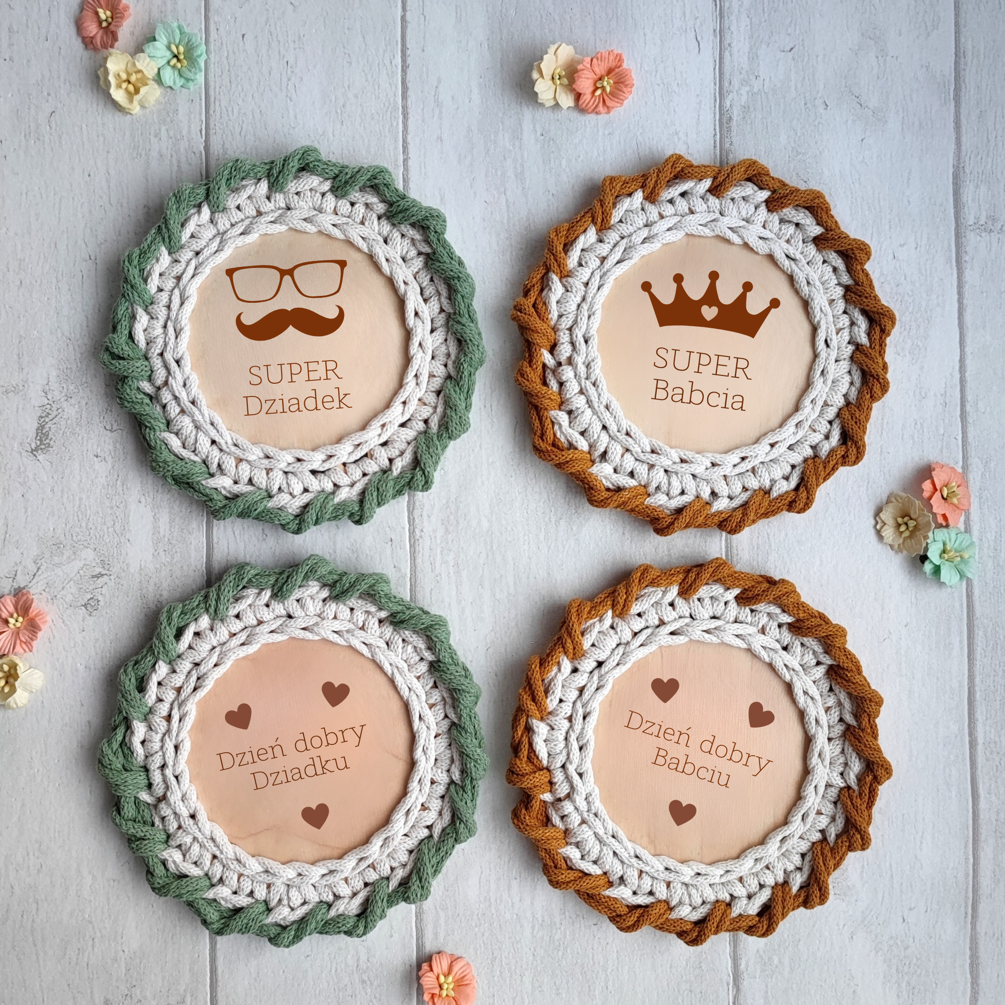 Z okazji zbliżającego się święta naszych kochanych Babć i Dziadków, oferuję zestaw 4 podkładek wykonanych ze sznurka bawełnianego 3 mm, na bazie ze sklejki drewnianej.
